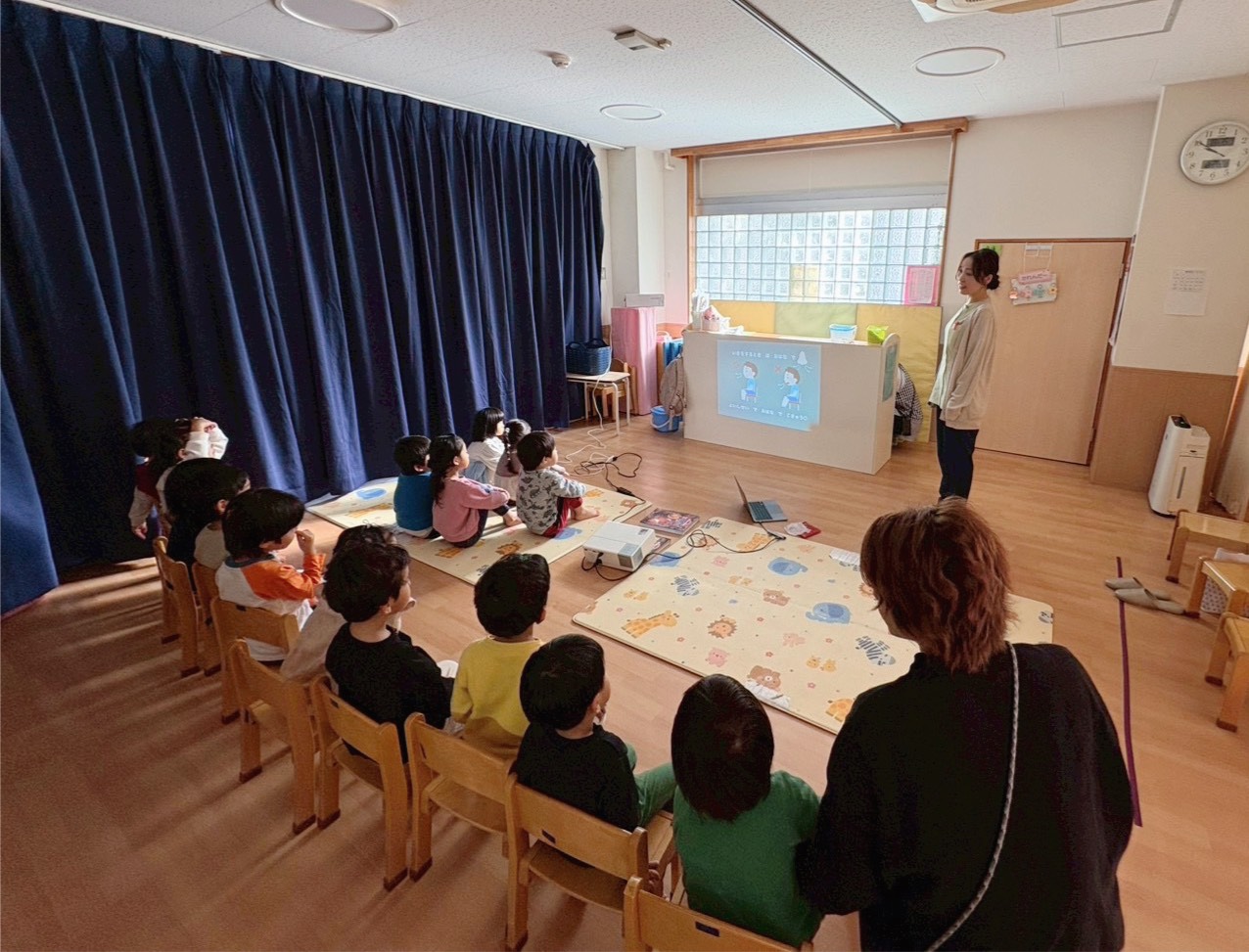 お口がぽかんと開いたままになり、スマホやタブレットの影響で姿勢が悪くなっている子をよく見かけます。今回はお口の働きから身体に姿勢やお鼻での呼吸、そしてお口の体操「あいうべ体操」のお話をしてきました。上顎の成長のピークは7歳です。楽しく体操してお口も身体も健康に。そしてこれからも元気いっぱいたくさんの笑顔が続いてくれると嬉しいです。